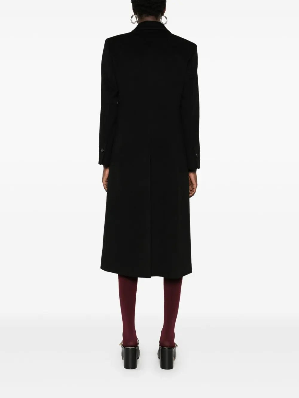 black virgin wool front button fastening peak lapels shoulder pads long sleeves buttoned cuffs chest welt pocket two side flap pockets central rear vent logo-jacquard lining straight hem mid-length Wool single-breasted coat Size and Fit - This piece fits true to size. We recommend you get your regular size. Model is 1,75m / 5ft 8in wearing size 40 (IT)