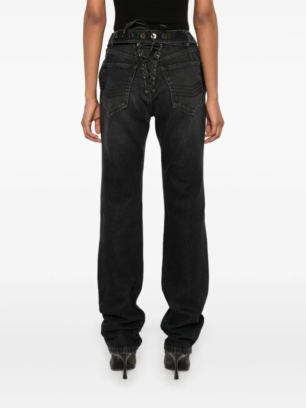 black cotton washed denim padded panels concealed fly and button fastening rear lace-up fastening belt loops waist tabs classic five pockets rear criss-cross straps ankle zips Padded deatils denim jeans Size and Fit - This piece fits true to size. We recommend you get your regular size. Model is 1,75m / 5ft 8in wearing size 27 (WAIST CM)